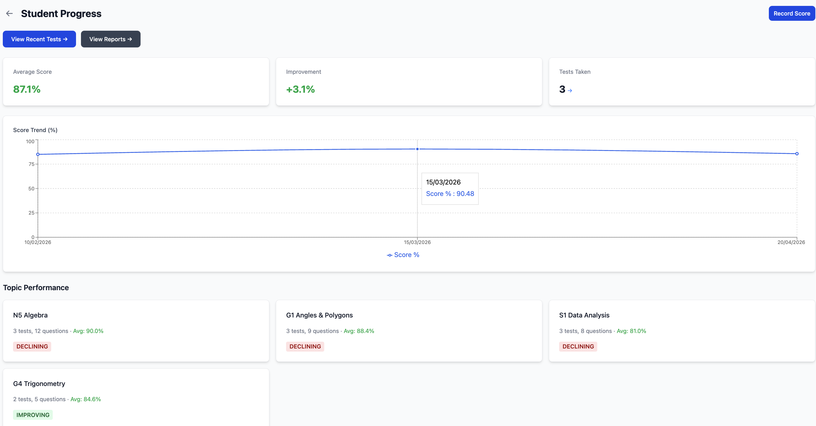 You're able to input students' exams' questions and their answers, and add notes on areas for improvement. You can also leverage GenAI to speed up the inputting of students' exam questions and answers and generate reports based on theprogress of the student to share back with parents, or just as reference to tailor your teaching strategy.
