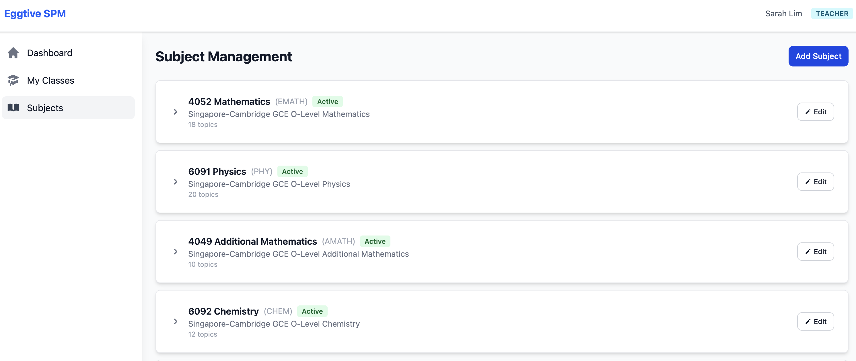 SPM has a built-in library of prepopulated subjects and topics, especially for the GCSE O'Level Exams based on the most updated syllabus from MOE. Admins and teachers are also able to add more subjects and topics to tailor to their requirements