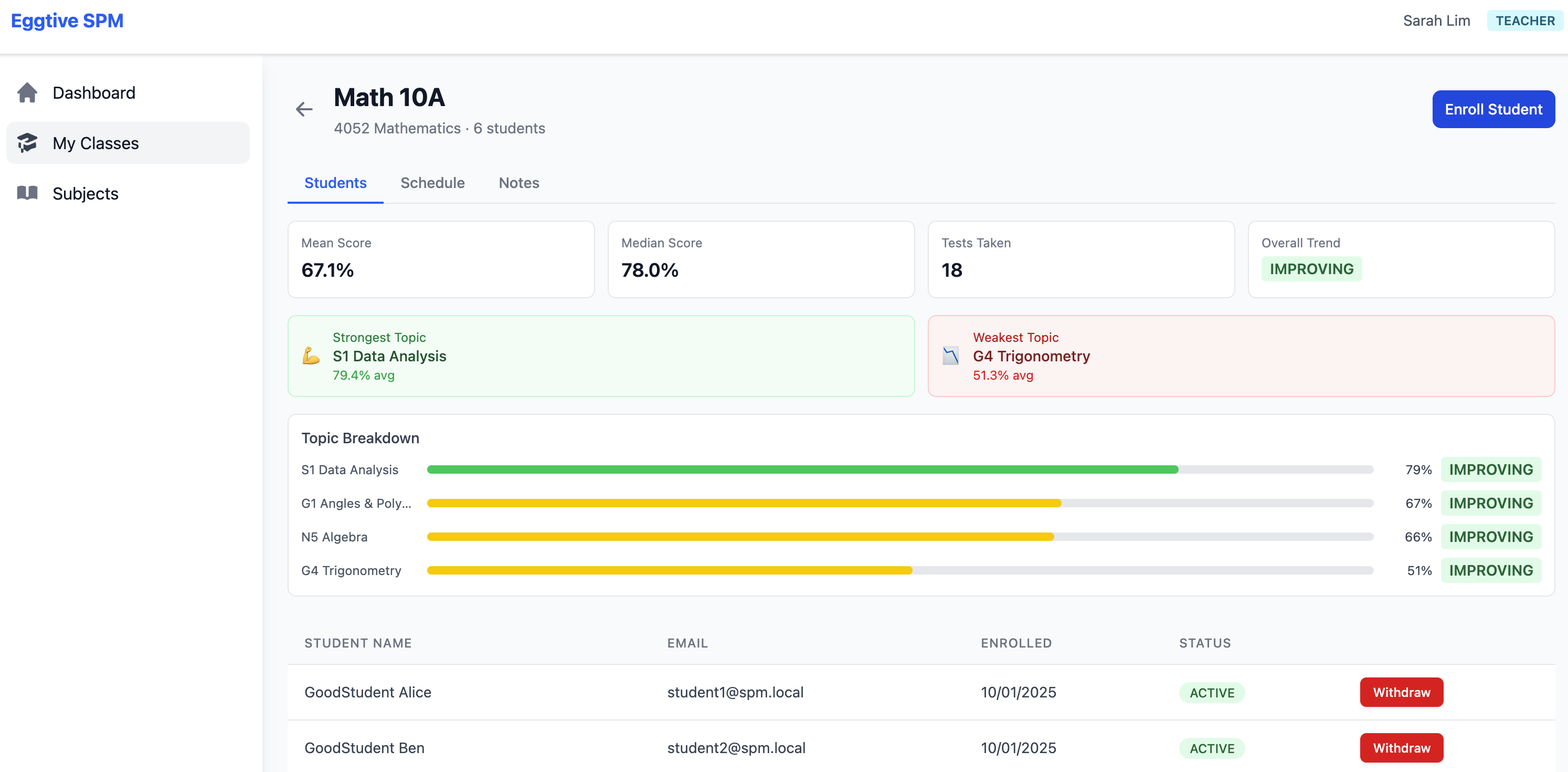 Every student has different areas of strengths and weaknesses for the subjects they need additional support for. Eggtive SPM allows you to dive deep into how a student is trending for specific topics, across their different exams (both from school, and the tuition center) over time.