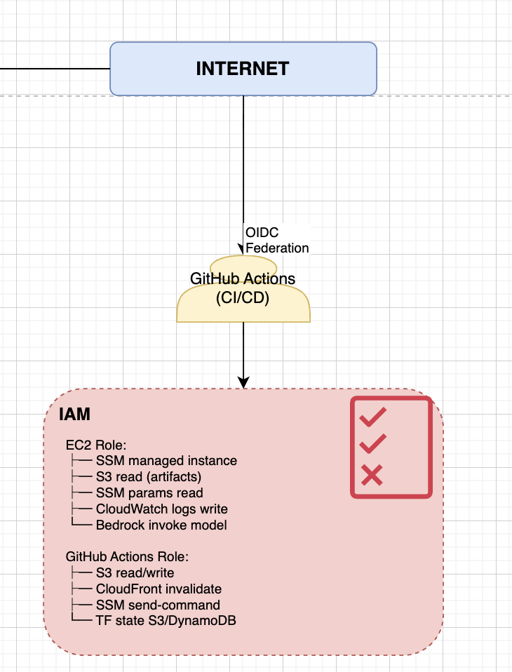 The CI/CD pipeline for the application is enabled via OIDC federation, meaning there's no need for long-lived keys to be on github. Github actions is able to compile the 2 source code (frontend react and backend springboot apps) and uploads the respective artifacts into th S3 bucket in the correct workload account per environment (dev/prod/customer's)