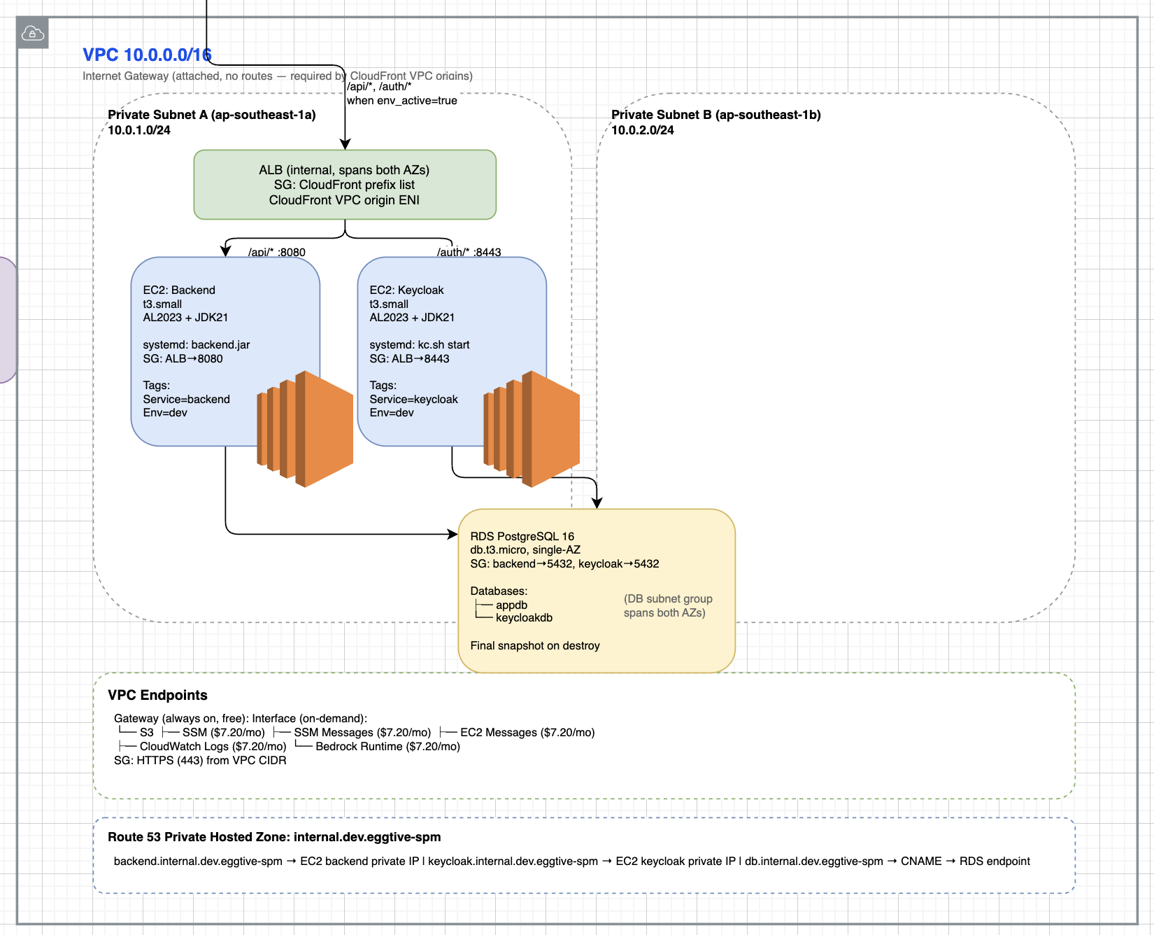 The backend of SPM runs on EC2 instances. One running the application server itself, one running the keycloak server and one running prometheus for metrics. Logs are ingested via CloudWatch Unified Agent, pointing at the /var/log/service.log files. So when the Java app or Keycloak writes to stdout/stderr, systemd writes the service stdout/stderr to a log file, and the CloudWatch agent picks it up from there. Internally, all the network is routed via VPC endpoints traffic stays within the AWS Network, and none have to traverse the internet. The only time traffic goes over the internet is when client side react makes api calls to the servers, and once the request hits the ALB it's all internal. The application server validates the JWT against the Keycloak server.