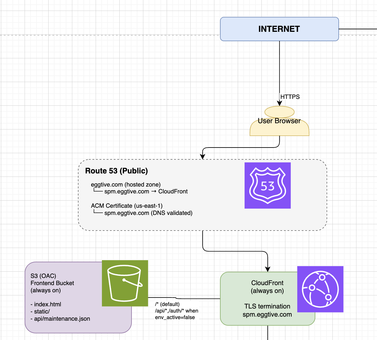 The frontend is a React App built with Vite, hosted on S3 behind CloudFront and Route53. OAC secures the private S3 buckets by allowing only the CloudFront distribution to access its contents, keeping the content secure. Infrastrcture related config details are injected at runtime via a config.json